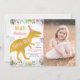This adorable birthday invitation features tropical watercolor leaves and flowers with a faux gold foil dinosaur.