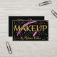 This stunning business card features a bold "MAKEUP" design in a glittery gold font, accented with pink lipstick and stars. The black background creates a dramatic and sophisticated look, perfect for a makeup artist who wants to make a lasting impression.