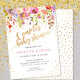 Watercolor florals in shades of pink with gold confetti baby shower invitation.