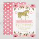 This sweet girl's faux gold glitter horse and a watercolor floral arrangement is ideal for a little girl who loves horses. It features a faux gold glitter silhouette of a horse and two pink horse shoes on a white background. The back of the invitation is a faux watercolor wash with a white polka dot pattern. More horse invitations are available at the store so please visit. This girl's faux gold glitter horse and floral birthday invitation is ready to be personalised.