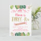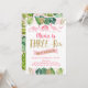This adorable birthday invitation features tropical watercolor leaves with gold glitter leaf embellishments and pink dinosaurs.