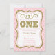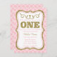 Celebrate your little girls first birthday in a fun way with this pink and gold glitter quatrefoil 1st birthday invitation.