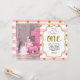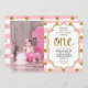 Pink stripes and gold glitter polka dots are featured on this classic girl's first birthday photo invitation. Use the template form to add your party details. The Customise feature can be used to add text to the back or change the font style.