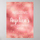 Birthday party welcome banner / sign with elegant sparkling gold glitter on a pink and gold background. Text is a cute handwritten script font, but is customisable if you want to change it. Contact us for help with customisations or to request matching products.