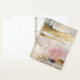 A mixed media, abstract design in gold, pink, and grey, with lacy, white imprints makes a beautiful planner. Perfect for home, the office, or at school.