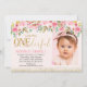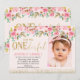 Sweet little miss onederful first birthday invitation with a mostly pink floral arrangement and a faux gold foil heading. The background is a pale pink background. Same design with a white back ground is also available at the store.