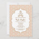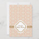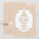 Elegant and beautiful french Moroccan inspired baby shower invitations with a repeating warm hued light blush pink pale coral and gold geometric pattern design and gold hued floral flourishes. This upscale and luxe looking invite is perfect for any formal, exotic, Moroccan, Arabian Nights or Aladdin themed baby shower for a baby girl. The back of these custom, fancy frame invites can be personalised with the first name of the mummy to be and event name on the quatrefoil shape and printed ribbon look design. Artwork and design © Chrissy H. Studios, LLC. All Rights Reserved.