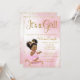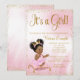 Pink and gold baby shower invitation with adorable African baby girl with cute afro hair and pretty pink tutu and pillow on a pink and gold glitter background. This pink and gold princess baby shower invitation is easily customised for your event by simply adding your details.