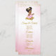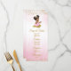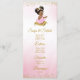 Princess baby shower menu with adorable African American ethnic princess baby girl wearing a cute pink outfit and string of pearls sitting on a pretty gold pillow on an elegant pink and gold background. These cute princess baby shower menus are easily customised for your event by simply adding your details in the font style and layout of your choice.