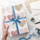Wrap your Valentine's Day gifts with love with this fun wrapping paper, featuring watercolor hearts in pink, gold, and cream tones.