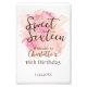 Set the tone for a memorable celebration with a beautiful pink watercolor background and sparkling gold glitter accents. Featuring bold script that highlights the ‘Sweet Sixteen’ message, this design blends chic style with a touch of glamour. Personalise it with the birthday girl’s name and date to create a stunning first impression at your party entrance. Perfect for adding sophistication and charm to your milestone event!