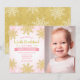 A modern and whimsical winter onederland first birthday photo invitation. This cute design features gold glitter snowflakes and light pink. NOT ACTUAL GLITTER