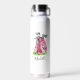 This cute monogram water bottle features a stylish pink watercolor golf bag filled with clubs, surrounded by a touch of green grass. The design cleverly incorporates a simple serif font initial monogram on the bag, seamlessly blending into the design. Below the monogram, the full name is elegantly displayed in script typography, adding a personal touch. The monogram is currently in a dark grey, almost black, to match the bag's accents, but it can be customised to your preferred colour.