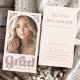 Modern, trendy light pink or custom colour graduation photo networking profile card with the text "grad" in a retro, bold font on the front. Add your name, year, school and photo. You can change the background colour, fonts and font colours, move and resize elements with the design tool.
