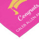 Custom Pink Graduation Party table runner with 'Congratulations / Name' on centre/top, and both ends.