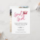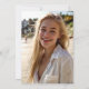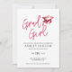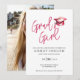 Modern graduation party invitation template card with script typography that says "Grad Girl" in pink writing. A watercolor drawing of a pink graduation hat. Option to add a photo to the back of the graduation card.