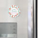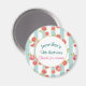 A birthday magnet featuring a digital image with a repeating pattern of pink grapefruits created with watercolors, set on a pastel green and white striped pattern. A white circle with a gold border holds your customised text.