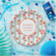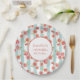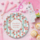 Paper plates with a repeating digital pattern of pink grapefruits created with watercolors, set on a pastel green and white striped pattern. A white circle with a gold coloured border sits in the centre and holds your personalised birthday info.
