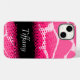 Bright animal patterned iphone case in black and pink hues. Personalise this item with first name. This example currently reads: Tiffany. © original pattern by Sarah Trett. Design is based on the patterning found on a giraffe with a halftone moire dot gain pattern overlay.