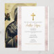 A beautiful Baptism design showcasing a pink rose gold Greek key border and a Greek Orthodox icon of the Virgin Mary on the reverse of the card. A religious design ideal for a baby girl's Baptism Christening. Matching stationery and décor can be viewed in this design's collection.
