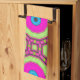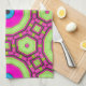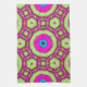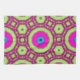 A green, pink, and blue abstract with circles, hexagons, and lines