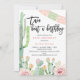 Pastel colored fiesta themed taco bout a birthday invitation featuring flowering cactus and Mexican banner in pink and mint. Ideal for someone looking for a girl's taco or fiesta themed birthday invitation for any age.