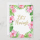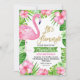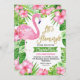 Colorful and bright green and pink let's flamingle birthday invitation. This design features brightly colored green foliage, a pink flamingo and hibiscus flower. Great for a let's flamingle themed girl birthday party.