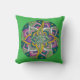 An intricately hand-drawn pink and green lotus mandala on a throw pillow.