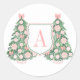 Stylised Christmas Trees decorated with pink and white ornaments. In front of these is a badge / shield shape containing a single initial (can be from the family name or from the first name). The watercolor elements were handpainted by me before being scanned into digital form (the shield shape is by another artist).
