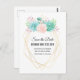 Wedding save the date postcard with a pretty pastel watercolor succulents bouquet. These succulent flowers, leaves and sprigs are a soft pink and green. A trendy geometric frame with a faux gold foil border.