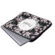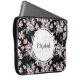 Personalised laptop sleeve with an elegant pattern made with a watercolor illustration of pink flowers with blue-grey leaves and stems. Classy black background.