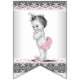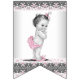 Pink and grey baby shower banner with adorable vintage baby girl wearing pink ruffle pants and bow on a pretty pink and black lace background. This pink and grey lace baby shower banner is easily customised for your event by simply adding your text in the wording and font style of your choice. This is a printed design with no real lace, bows, etc.