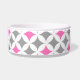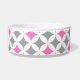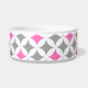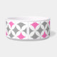 Fun and modern dog bowl in dark grey, fuchsia hot pink and white retro and casual circles and diamonds bold geometric pattern. Personalise this dog bowl with your own text for a unique food or water bowl for your puppy.