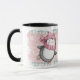 On this pretty Holiday mug, an adorable penguin is dressed in pink and grey and is ice skating. On the other side is stylised text that says "It's the most wonderful time of the year". Everything is placed on a pink background with white snowflakes, and edged in grey and white plaid. Unique and festive!