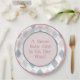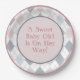 Super cute, pink, grey and white argyle patterned paper plates coordinate with the Baby Lambs Leaping Baby Shower Suite. Text reads "A sweet baby girl is on her way" in the centre.