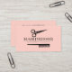 A business card for a professional hairdresser in pink tones featuring illustration of scissors and comb over with modern and stylish font. Perfect for hair salon or barber.