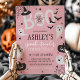 Boo! Enjoy this pink Halloween Birthday Invitation. It features the phrase "BOO" with ghosts, pumpkins, bats, and a witch hat. This invite is the perfect way to invite guests to your spooktacular birthday or Halloween party!