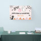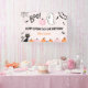 Cute girl's Halloween birthday banner featuring a ghost, cobwebs, black cat, pink and orange pumpkins, bats and more on a pale pink background.