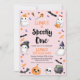 Cute Halloween themed girl's first birthday invitation featuring four ghosts, pumpkin, bats, candy and more on a pink background. This Halloween themed girl's first birthday invitation is ideal for an October birthday party.