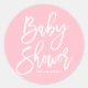 Customisable baby shower sticker featuring pink hand-lettered script. Personalise by adding the event date or celebrant's name. Perfect for invitations and event favours. Other colours and matching items are available.