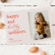 Modern and simple Christmas card for 2021 featuring pink and red typography text with a script that says "happy and healthy holidays".