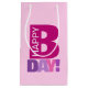 A girly pinkish Happy Birthday gift bag with the words "Happy Bday!" in various shades of pink and purple.