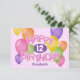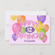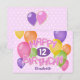 This fun and colourful birthday card for a girl is downloadable and features the message "Happy Birthday" spelled out in realistic, whimsically arranged pink frosted cutout cookies on the front of the card surrounded by multicolor balloons - message on back and child's age and name can be personalised - two balloon-shaped cutout cookies accent the back of the card - background is a pattern of small white polka dots on pale pink - by katz_d_zynes