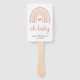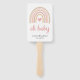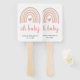 Cute Baby Shower Hand Fan with a boho rainbow in muted pastel colours along with a pink heart in the middle. Below is "oh baby" in script along with your name, event title and date. These custom hand fans are a great addition to a girl baby shower.