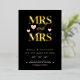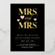 Romantic typography wedding invitation in black for a lesbian wedding with MRS and MRS written in bold gold foil letters with a swirly and, and pink hearts. Add details about your wedding to the back.