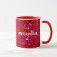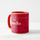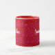 A handwritten, personalised name of your choice is set against a playful background of tiny foil pink hearts and dots on red glitter. Spread love and joy whenever you drink out of this colourful, stylish and modern custom name coffee mug. This is a great gift for Valentine’s Day, birthdays, anniversaries, engagements, or for an anytime “I love you” gift. Send this to someone special!