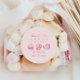 Whimsical Valentine theme girl baby shower favour sticker featuring illustration of pink heart-shaped macarons.