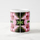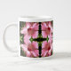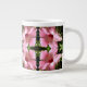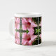 On this giant Mug - Made from an original photograph by HomeWare, bright pink hibiscus flowers are the subject of this original tropical garden pattern with a "country floral" look. There are four beautiful, wide open blooms facing inward from each corner. The flower petals are a very deep pink in the centre, gracefully curving outward as the petals change to a lighter pink colour. The background is a pattern made up of the shades of natural green in the plant's leaves.