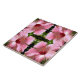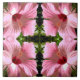 On this large Ceramic Tile, bright pink hibiscus flowers are the subject of the tropical garden pattern with a "country floral" look. There are four beautiful, wide open blooms facing inward from each corner. The flower petals are a very deep pink in the centre, gracefully curving outward as the petals change to a lighter pink colour. The background is a pattern made up of the shades of natural green in the plant's leaves. This pattern was made from an original photograph by HomeWare.
