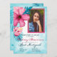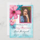 Celebrate your tropical themed bat mitzvah with a pink hibiscus flower, tropical ginger, pink gumdrop flower, turquoise island palm leaves, and a pink glitter photo frame. Beautiful flower petal design set is complete with coordinated rsvp enclosure cards, thank you cards, and mailing accessories. This cards is versatile for tropical wedding invitations or sweet 16 birthday parties.